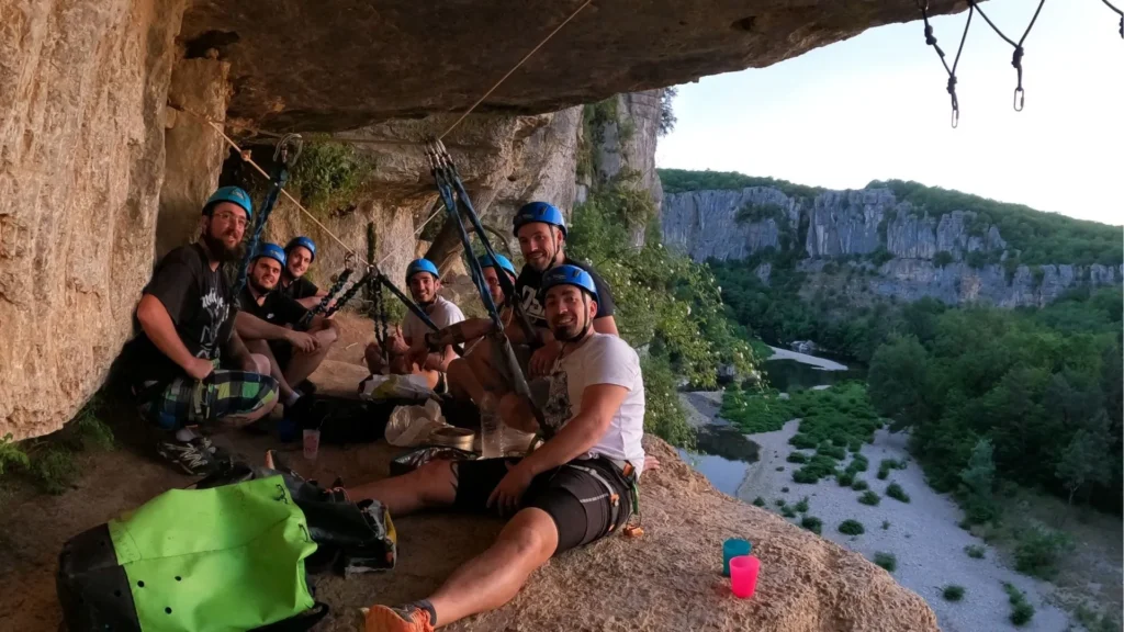 Une rando verticale sur une petite vire surplombant le Chassezac, agrémentée de pont de singe, grotte, corde suspendu.