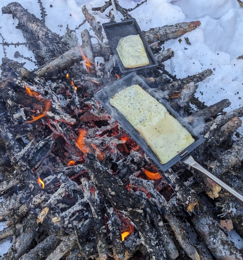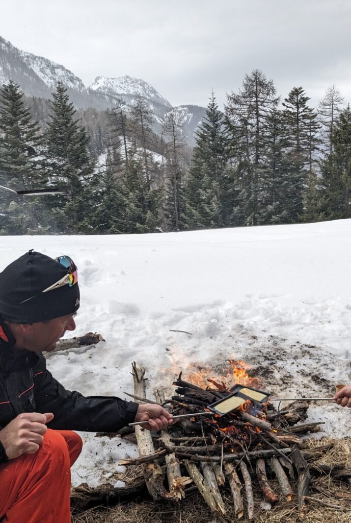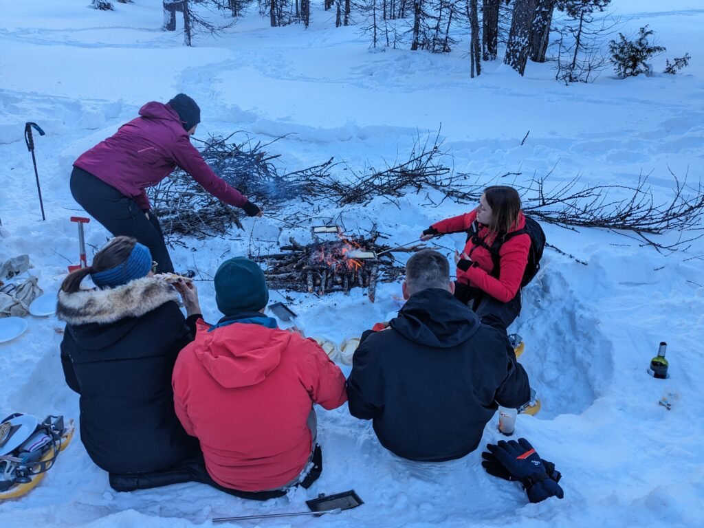 Une belle balade en raquette dans la neige, à la recherche de traces et indices laissés par les animaux, pour accéder à une jolie terrasse avec vue panoramique. Une fois notre feu allumé et crépitant, vous dégusterez à l’aide de nos poêlons une raclette de produits locaux (fromage de pays, charcuterie artisanale, pomme de terre de pays, vin rouge, jus de fruits, …).