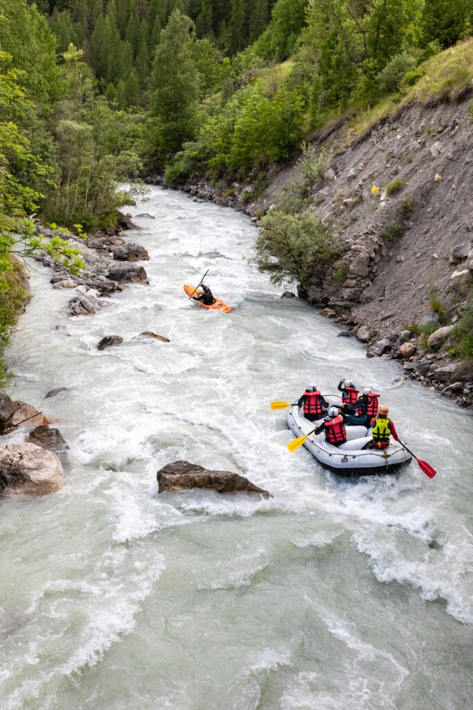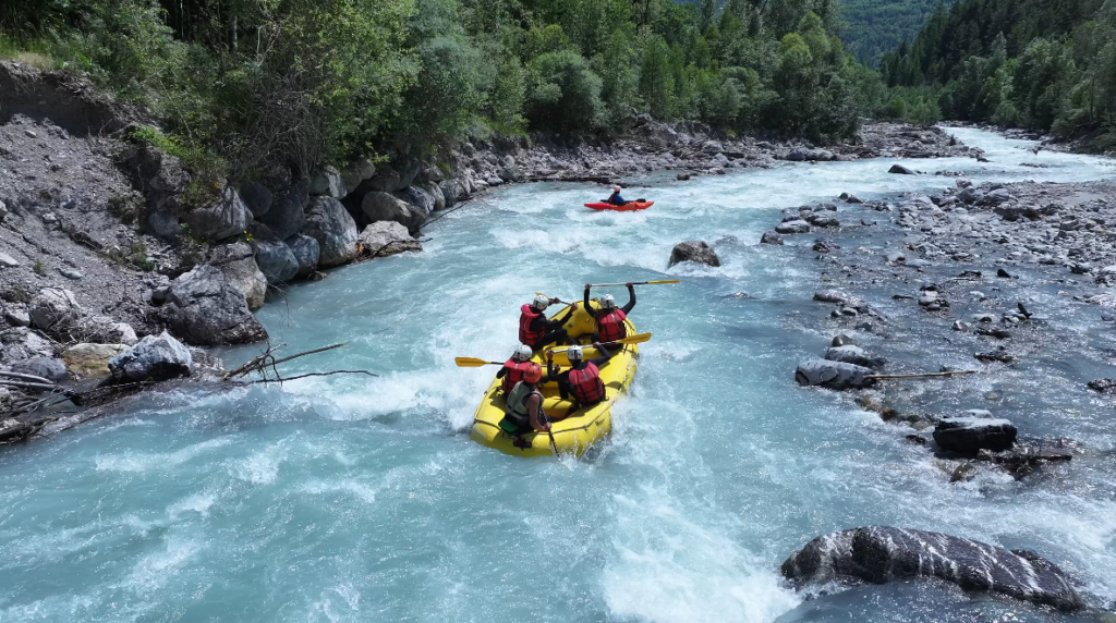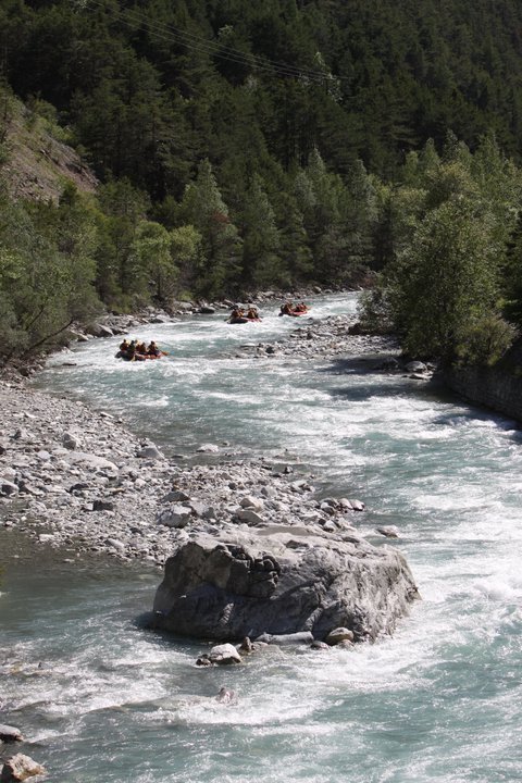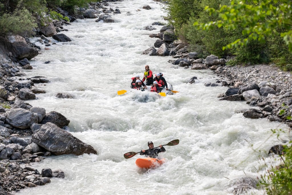 Le Gyr (Mai – Septembre) – parcours sportif, voir EXTREME , Accrochez vous bien, c’est le parcours le plus intense, technique et engagé en période d’été (Juillet – Août) – On a pas vraiment le temps de profiter du paysage alors on le fait 2 FOIS de suite – Embarquement sous la Via Ferrata d’Ailefroide jusqu’à Vallouise, 4,5km de rapides qui s’enchaînent quasi sans discontinuité, le matin des niveaux d’eau plus « bas » rendent le parcours très technique mais abordable aux moins expérimentés/téméraires, plus la journée avance, plus les niveaux d’eau montent avec les températures, plus le parcours est sportif, voir extrême, on dévale à plus de 20km/h les rapides – CONCENTRATION et ENGAGEMENT MAXIMALE!